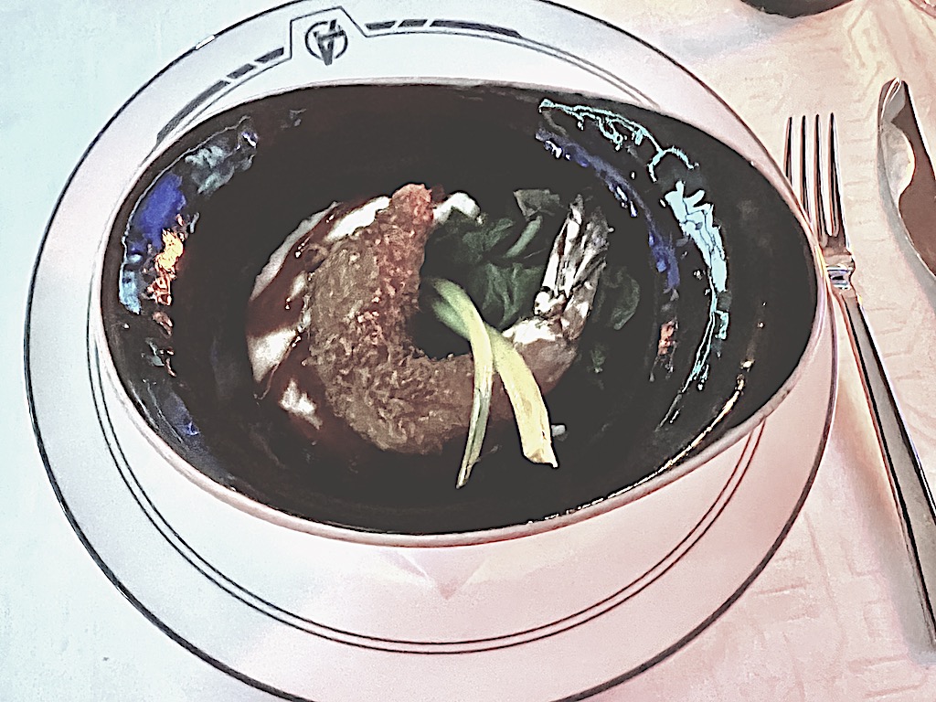 And here are the main dishes we tried: The Delmonico Rib-Eye Steak with Black Truffle Butter with Whipped Yukon Gold Potatoes, Green Asparagus, and a Cabernet Reduction was promising, but, unfortunately, it came at room temperature, which made it impossible for the truffle butter to smoothly melt over the steak.