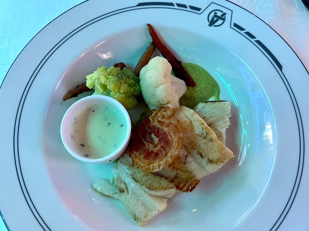The Seared Turbot Filet with Sweet Pea Purée, Roasted Heirloom Carrots, Romanesco, Pancetta, and Tarragon Sandefjord Sauce was excellent.